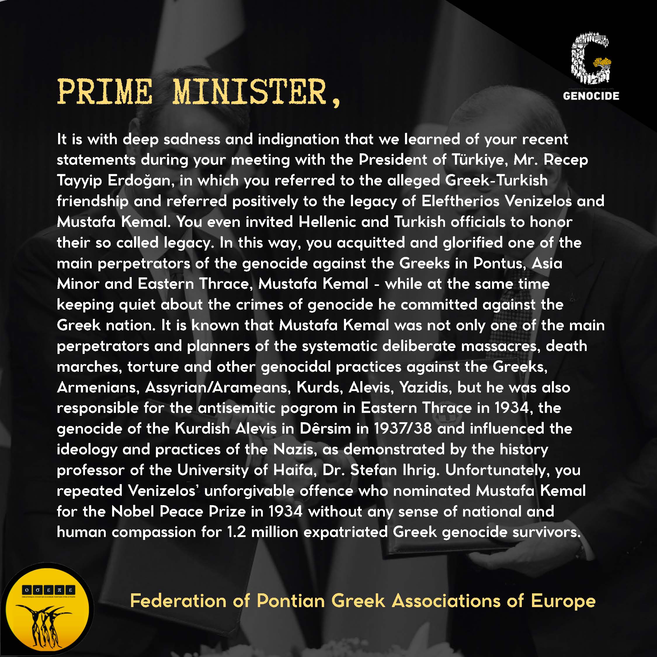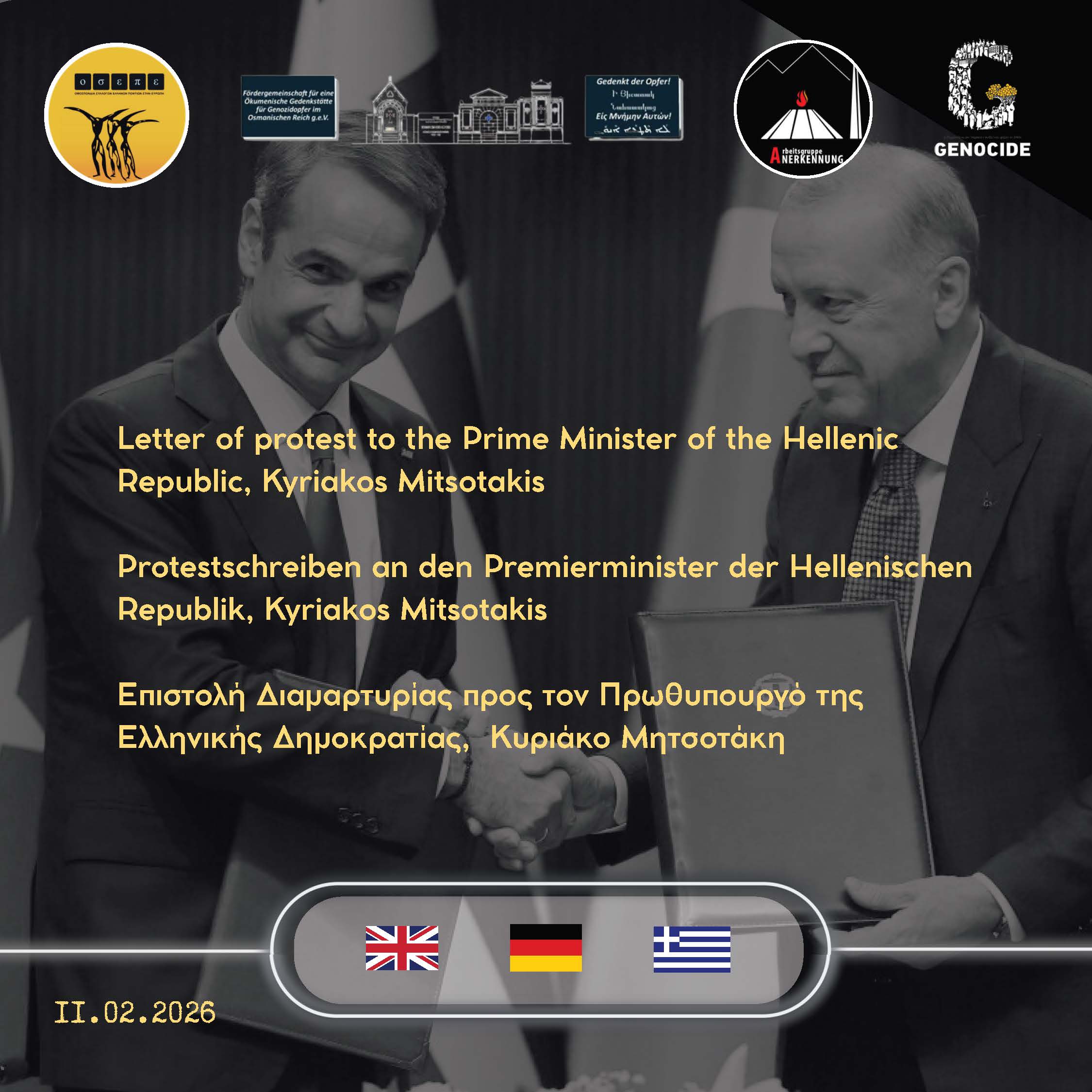 die Arbeitsgruppe Anerkennung – Gegen Genozid, für Völkerverständigung e.V. sowie die Fördergemeinschaft für eine ökumenische Gedenkstätte für Genozidopfer im Osmanischen Reich e.V. – protestierten beim Regierungschef der Hellenischen Republik für sein Verhalten während seines jüngsten Staatsbesuchs in der Türkei. Hier der Wortlaut in Englisch, Deutsch und Griechisch: