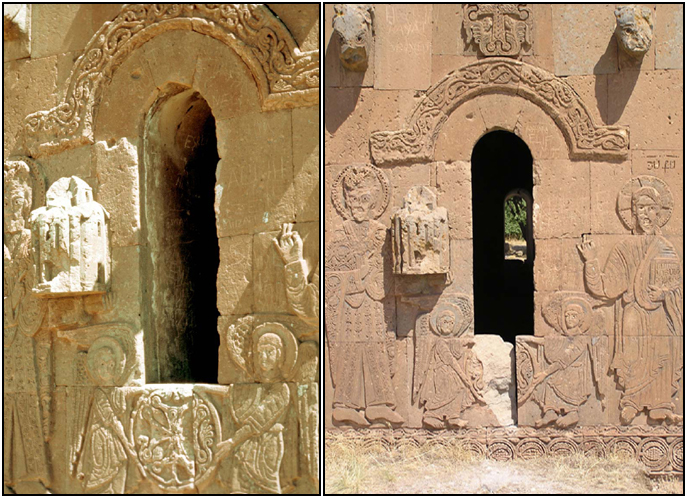 Es besteht aus dem Löwen (Wappentier der armenischen Königsdynastie der Bagratuni bzw. Bagratiden) und dem Kreuz. Links die Ansicht vor 1920, rechts die Ansicht nach den türkischen 'Reparaturen' in den späten 1990er Jahren. Die absichtliche Zerstörung des Kreuzes ist offensichtlich.
