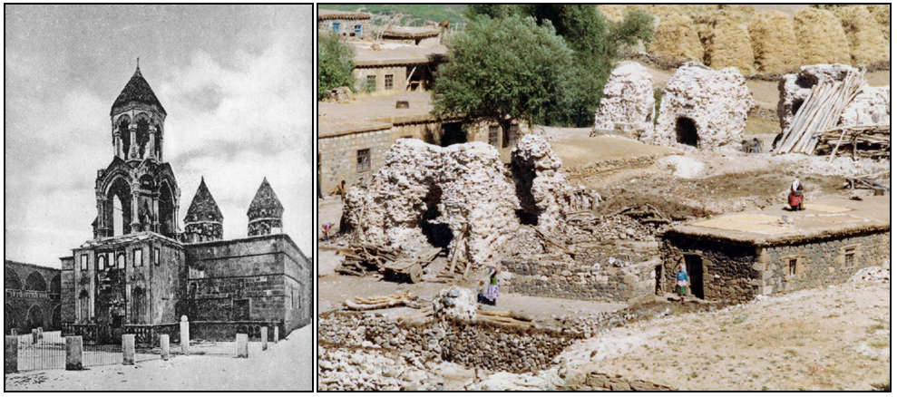 Das Kloster des Hl. Täufers Johannes (Surb Karapet) bei Musch, errichtet vom 4. bis 18. Jahrhundert und während des Völkermordes 1915 zerstört. Links der Zustand vor 1915, rechts das Dorf Cangli, das an der Stelle des Klosters Surb Karapet und mit seinen Steinen errichtet wurde.