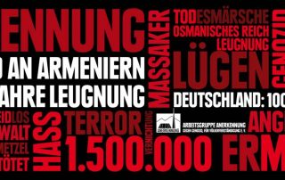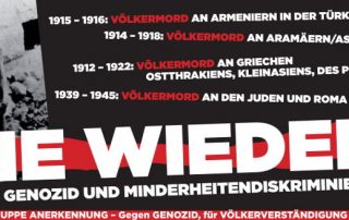 2015 jährt sich das Gedenken an die staatlich geplante und organisierte Vernichtung von Armeniern, Aramäern/Assyrern/Chaldäern sowie an griechisch-orthodoxen Christen im Osmanischen Reich zum 100. Mal. Die Arbeitsgruppe Anerkennung – Gegen Genozid, für Völkerverständigung e.V. ruft aus diesem Anlass zu ...