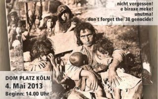 Die Föderation der Dersim-Gemeinden in Europa e.V. sowie neun unterstützende Verbände und Vereine rufen zu der Veranstaltung auf: Kölner Domplatz, 4. Mai 2013, ab 14:00 Uhr: Mahnwache und Kundgebung aus Anlass des Jahresgedenkens an den Dersim-Genozid Downloads: ...