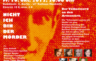 Die Wiederaufnahme der Lesung aus dem Prozess-Protokoll des Strafverfahrens gegen den armenischen Attentäter Soromon Tehlirjan – bekannter als „Prozess Talaat Pascha“ – findet am Rroma Aether Klub Theater, Boddinstr. 5 in Berlin-Neukölln statt (Verkehrsverbindung: U7 Rathaus Neukölln). Links: ...