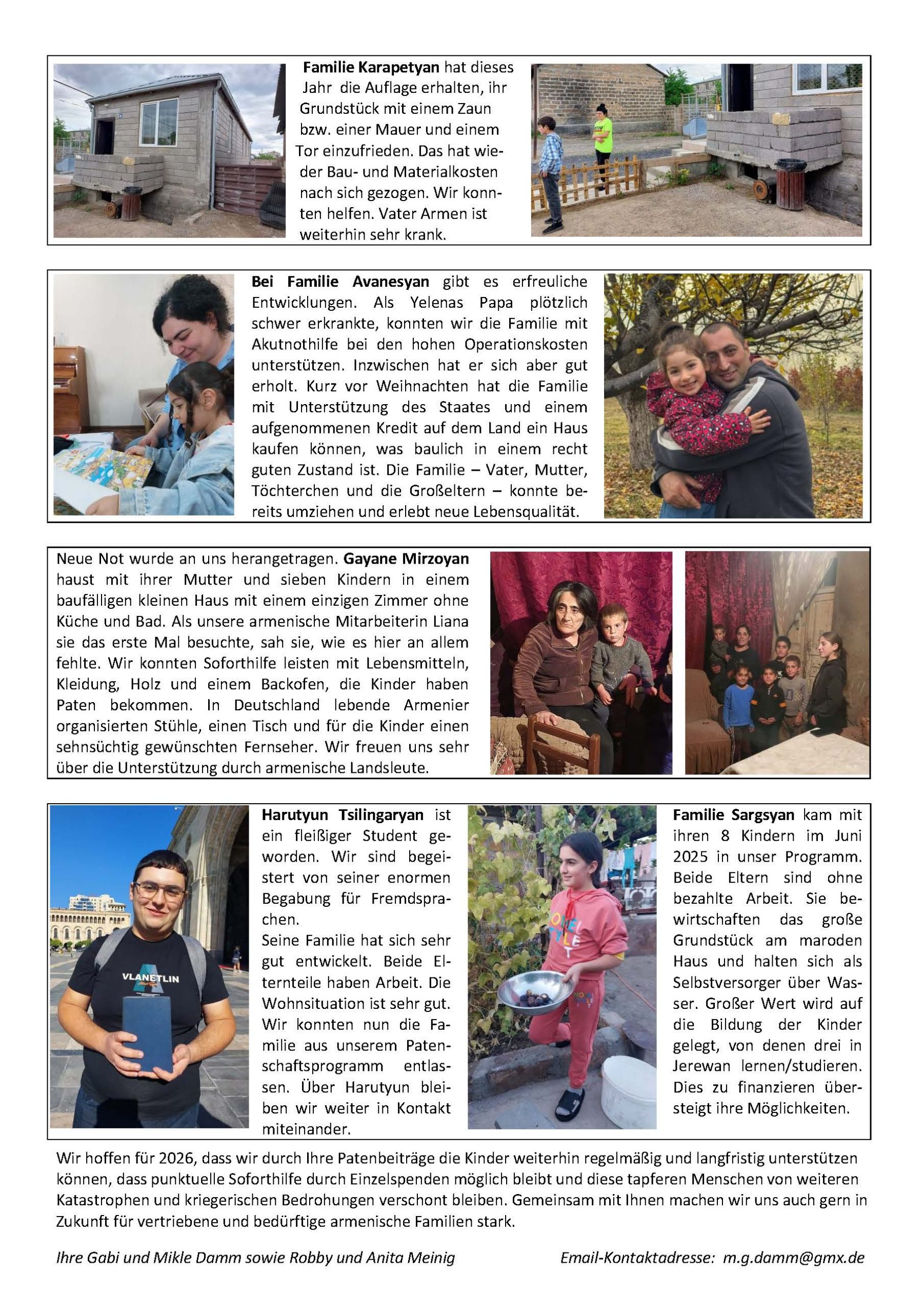 Die Armenienhilfe Holzhausen Schlöben (Thüringen) betreut patenschaftlich bedürftige Flüchtlingsfamilien aus Arzach in der Republik Armenien. Wir veröffentlichen nachstehend den Spenderbrief für 2025 mit der Bitte, die Fortsetzung der Hilfe durch Ihre Zuwendung zu unterstützen. Die Kontoverbindung nebst Verwendungszweck sowie eine Kontaktemailanschrift finden Sie im Spenderbrief: